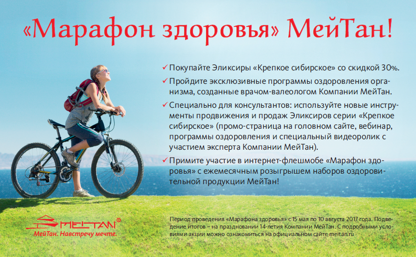 Сколько времени нужно человеку, чтобы обзавестись новой привычкой? Говорят, для этого нужен 21 день... Но мы уверены, что при помощи Эликсиров «Крепкое сибирское» полезную привычку можно приобрести в 2 раза быстрее! Компания МейТан приглашает именно тебя принять участие в масштабном проекте «Марафон здоровья»! Докажи всем и, в первую очередь, себе, что жить активно и регулярно заботиться о своем здоровье - это просто! Стань примером для своих близких и друзей!